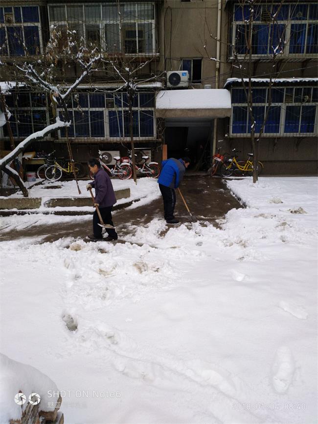 1月4日一大早,后勤保障部,兵分三路分別對南區(qū)家屬院、北區(qū)家屬和院建國路辦公區(qū)的積雪進行清掃,大家利用鐵鍬、掃帚等工具將積雪鏟走,清理出道路,在積雪較厚的地方撒除雪劑。在大家的帶動下我院退休職工李克銀、高賢峰、李君、婁季功,職工家屬李赟、賈愛榮等也紛紛加入掃雪隊伍。盡管天氣寒冷,但大家團結協(xié)作,干勁十足,經(jīng)過3個多小時的共同努力,家屬區(qū)路面上的積雪、碎冰已被清掃干凈,道路暢通無阻,來往職工家屬紛紛稱贊,并表示感謝。