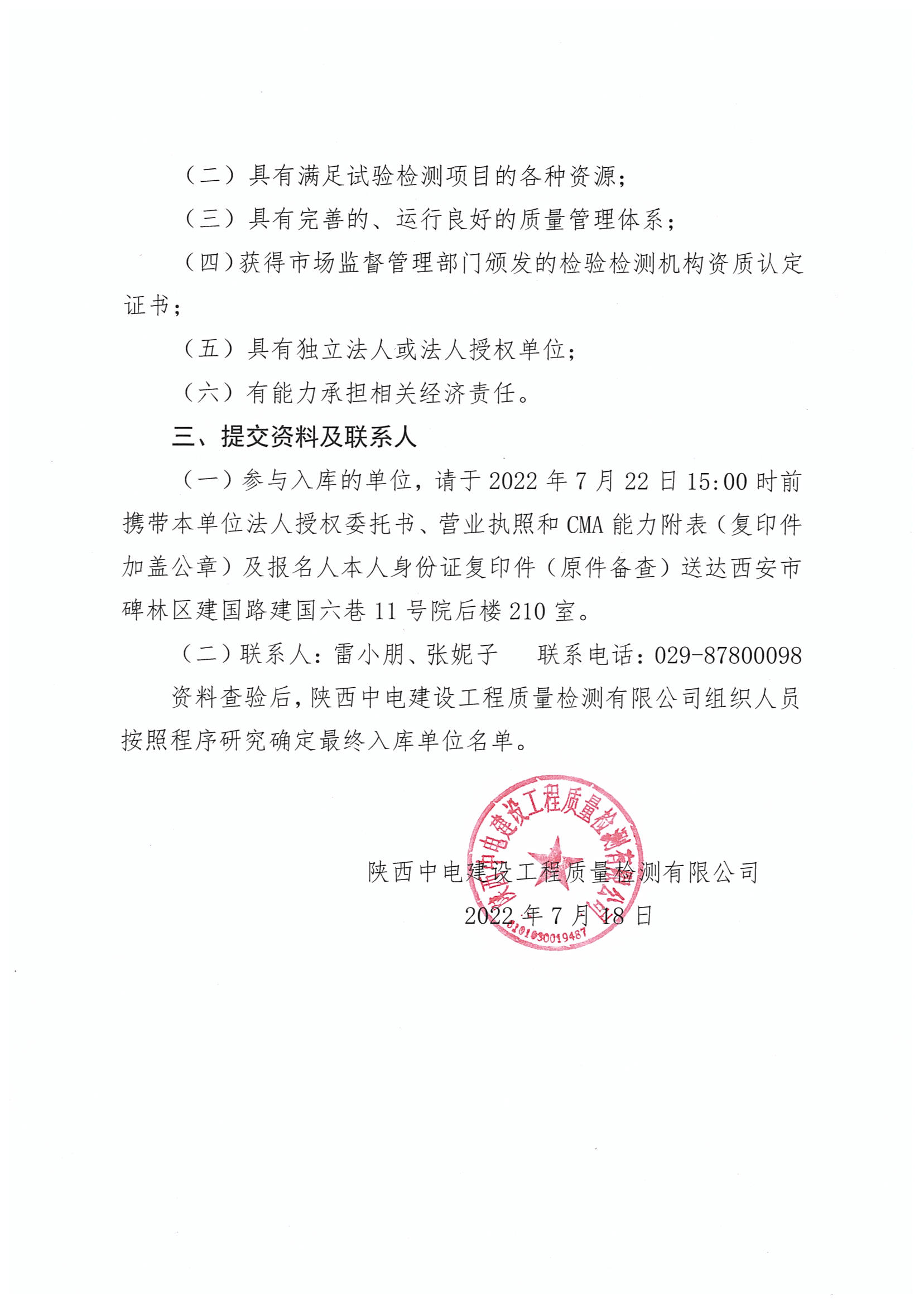 陜西中電建設(shè)工程質(zhì)量檢測(cè)有限公司關(guān)于地基試驗(yàn)檢測(cè)項(xiàng)目分包合格供方采購(gòu)入庫(kù)登記的公告