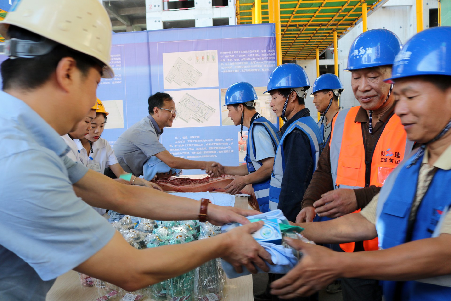 匯報會后,由五建項目部工作人員帶領大家參觀樣板間,各方代表來到1號樓屋面,舉行簡單而正式的封頂儀式,各方共同為項目主體結構澆筑最后一锨混泥土,并合影留念。由李曦濤院長和紅禾公司樊總為現(xiàn)場工友和五建管理人員發(fā)放了慰問品和紀念杯。