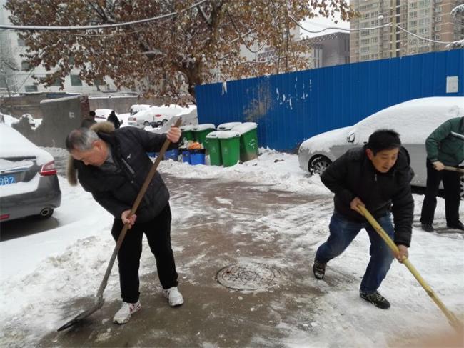 1月4日一大早,后勤保障部,兵分三路分別對南區(qū)家屬院、北區(qū)家屬和院建國路辦公區(qū)的積雪進行清掃,大家利用鐵鍬、掃帚等工具將積雪鏟走,清理出道路,在積雪較厚的地方撒除雪劑。在大家的帶動下我院退休職工李克銀、高賢峰、李君、婁季功,職工家屬李赟、賈愛榮等也紛紛加入掃雪隊伍。盡管天氣寒冷,但大家團結協(xié)作,干勁十足,經(jīng)過3個多小時的共同努力,家屬區(qū)路面上的積雪、碎冰已被清掃干凈,道路暢通無阻,來往職工家屬紛紛稱贊,并表示感謝。