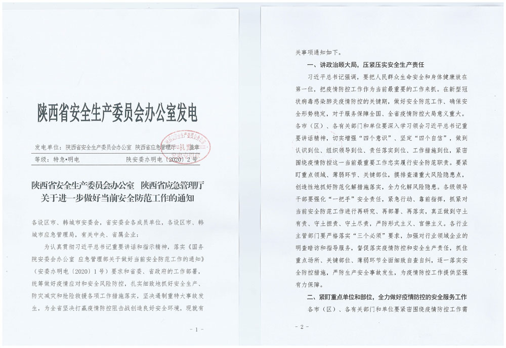 轉(zhuǎn)發(fā) 陜安委辦明電【2020】2號(hào) 《陜西省安全生產(chǎn)委員會(huì)辦公室 陜西省應(yīng)急管理廳 關(guān)于進(jìn)一步做好當(dāng)前安全防范工作的通知》
